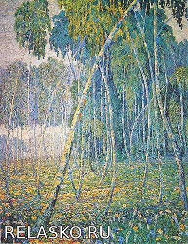 Одна из таких картин «Утро весны», не смотря на преобладание холодных синих тонов, зелень травы и желтизна цветов и солнечных лучей смягчают общий вид и дают ощущение тепла и спокойствия. На этой картине можно увидеть сразу два пробуждения природы, первое- это наступление весеннего утра в березовой роще, а второе- пробуждение всей природы после долгой зимы. Между березами зеленеет трава, цветут первые цветы и все это ярко переливается в каплях росы и лучах утреннего солнца. На первый взгляд здесь просто изображена природа, но стоит задуматься, взглянуть глубже и увидишь совсем иное.