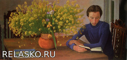 Кажется, что любоваться на изображенный букет можно бесконечно долго. Он так и манит своими нежно-желтыми лепестками, тонкими изумрудно-зелеными стеблями в незатейливом горшке. Так и хочется оказаться возле читающего человека и вдохнуть аромат этих чарующих цветов.