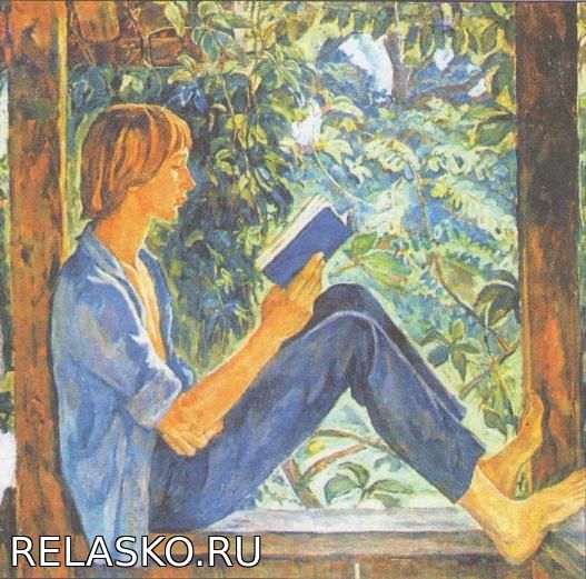 Картина поражает каким-то светлым колоритом, радостью, разлитой в каждой детали. Внимание привлекает герой картины мальчик-подросток. Он забрался на подоконник террасы и читает книгу. Он увлечен чтением настолько, что не замечает ничего вокруг. Мальчик, назовем его Витя, одет в темно-синие брюки, голубую рубашку. Ее он не застегнул, а рукава закатал. Наверное, на улице очень тепло, даже жарко. Потому он и вышел на террасу, чтобы прохладный ветерок из сада освежал его, разгоняя жару. Светлые, с рыжиной, волосы свободно обрамляют одухотворенное лицо.