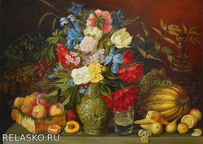 Глядя на эту картину, кажется, что запах спелых фруктов и цветов витает в воздухе. Так и хочется наклониться к букету, и вдохнуть аромат цветов. А фрукты попробовать на вкус. Они прямо сами просятся в рот. Эту картину можно повесить дома, в столовой. Она будет отлично гармонировать с настоящими фруктами, поставленными на обеденный стол.