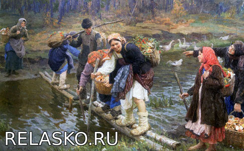 Скромное одеяние выдает их бедность, но это не мешает людям быть счастливыми. Скорее всего, они держат путь на базар, их кошелки наполнены грибами, яблоками и другими вкусностями. Собрав осенние дары, селяне идут заработать копеечку.