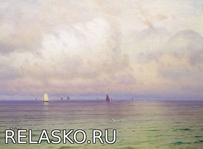 На этой картине мы видим тихое море. Парусники дрейфуют вдали. На белом фоне облачного неба море выглядит завораживающе. Картина выполнена в нежных тонах, что навевает спокойные мысли. Полотно вызывает чувство умиротворения. Так хочется посидеть в закатных лучах солнца на берегу, полюбоваться красивым морем. Почувствовать легкий, теплый ветерок и насладиться спокойствием природы. На этой картине художник показывает нам морской пейзаж, которым хочется долго любоваться.