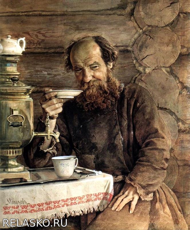 Главный герой картины - немолодой мужчина, с выгоревшей кудрявой бородой, кудлатой головой, одетый в старую, местами протертую, местами наспех зашитую одежду. Сидит за столом приосанившись, опершись одной рукой на ногу, другую - поставив локтем на стол. Он не красуется, это его привычная поза. Видно, что это истинно русский человек, которого мы застали за неспешным чаепитием. В те времена за чаем человек отдыхал, приходил в себя и согревался после трудной дороги или тяжелой работы.