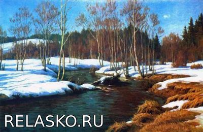 На левом берегу еще лежит белоснежное покрывало снега без единой проталины, а по правой стороне у самой воды уже видно прошлогоднюю желтую траву. По обе стороны от воды стоят стройные еще голые деревья, несколько кустов, а на заднем плане густой рощей растут высокие зеленые сосны.