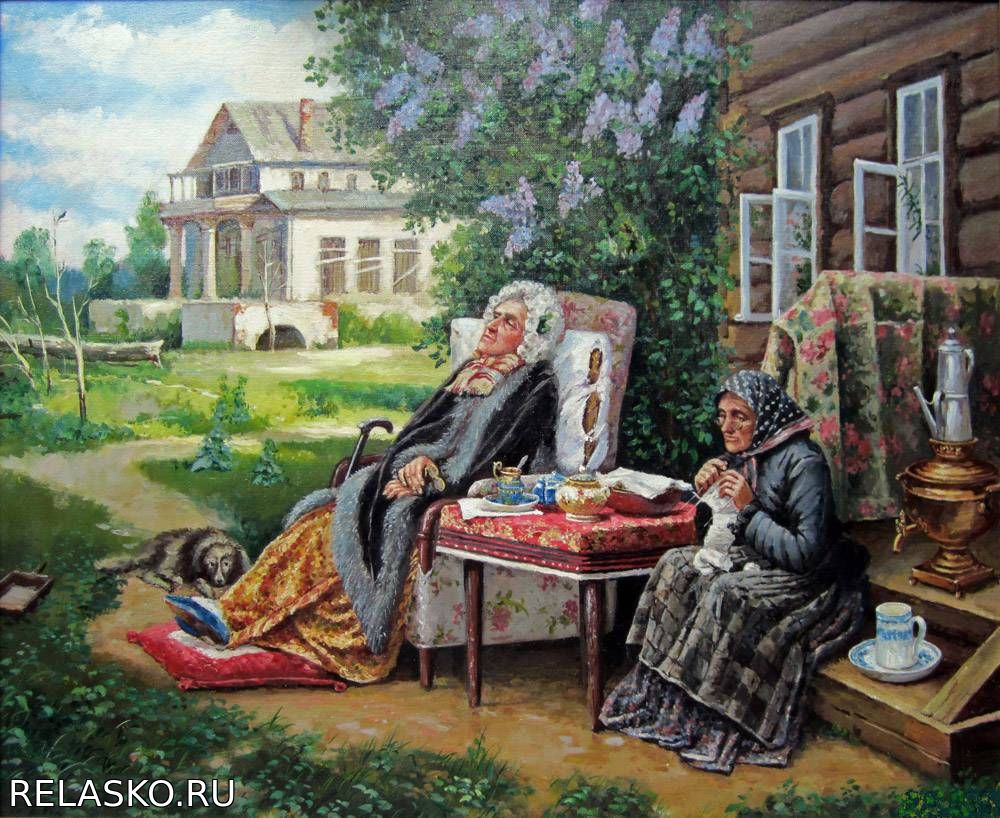 Наверное, на картине запечатлен май, потому что благоухают кусты сирени, испуская неповторимый аромат. В ясном и истом небе высоко летают ласточки. Рядом с госпожой сидит на ступеньке ее помощница, женщина таких же лет, как и ее барыня. Она что-то вяжет, параллельно разговаривая, наверное, этим женщинам есть о чем вспомнить, они вместе живут многие годы, вместе и встречают старость. Рядом с ними стоит самовар, из которого они и пьют чай. Около хозяйки лежит пес, он тоже уже немолодой, он спокойно лежит и греется. Он символизирует верность и преданность. Они сидят на фоне бревенчатого дома, мы видим лишь его часть, в нем настежь открыты окна, чистый и свежий воздух насыщает их комнаты.