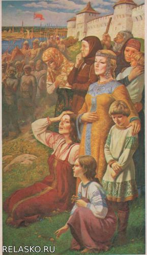 Жители Беременная женщина, которая отправила своего мужа, маленькие дети, которые еще не совсем понимают, что происходит, старики, которые уже был в подобных ситуациях. Художник очень хорошо передает весь быт и одежду наших героев, так как мы можем насладится русскими национальными одеяниями и рассмотреть все мелочи, которые их украшают. Великое горе, которое собрало всех людей в одну команду, которая будет болеть за своих воинов, которые просто обязаны разгромит коварного врага, который позарился на их земли, но сделать это будет не так и просто, так как есть очень большая вероятность, что многие из воинов просто погибнут, и тогда всех ждет еще большее разочарование, так как все будут оплакивать погибших.