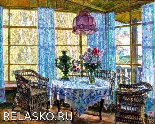 В комнате висят голубые занавески, которые отлично сочетаются со скатертью. Но окна не задернуты. Благодаря этому на веранд очень светло и уютно. На столе стоит ваза с сочными фруктами. Рядом самовар и цветы, собранные в саду.