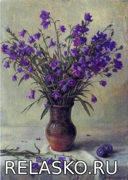 Одно из удивительных полотен имеет название «Колокольчики мои». На однотонном серовато – голубом фоне стоит шикарный букет фиолетовых колокольчиков. Яркие цветочки облепили тонкий стебель и наклонили головки немного вниз. Кажется, аромат букета заполнил все пространство комнаты и вырывается наружу с картины. Полотно всем своим видом манит подойти поближе, наклонится и вдохнуть сладкий запах полевых цветов.