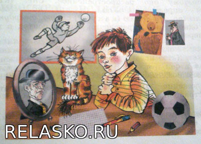 Кроме того, на стене висит фотография. На ней мальчик пытается словить летящий мяч. Значит, он вратарь. Так же он может быть упомянет о своем верном товарище – рыжем коте. Несомненно, он вытворяет какие-нибудь проказы. Мальчик старательно продумывает каждую строчку своего письма. Значит, он действительно хорошо относится к дедушке, пытается не упустить ничего важного.