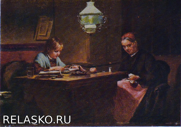 Комната наполнена темным светом, ну им до этого не дела. Бабушка сидит на против внучки и вышивает ей какую то "побрякушку". Она делает это ради нее. Потому, что она старается и делает уроки. А внучка сидя на против бабушки читает интересный рассказ, даже не смотрит на подарок, от бабушки. Эта картина замечательная, потому, что в ней есть любовь и интерес обоих героин картины.