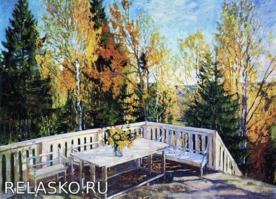 На картине изображен угол шикарной белой веранды, окруженной резными перилами. В России террасы всегда были любимым местом отдыха в загородном доме. Веранда большая и просторная. Вообще, простор, главная тема этой картины. Широкая лестница спускается вниз, к реке,окруженной зелеными лугами. На террасе расставлены скамьи и стол, чтобы люди, проживающие здесь, могли любоваться прекрасным видом, открывающимся отсюда. На столе – стеклянная ваза с желтыми поникшими листьями, в тон с осенней листвой. Чьи-то заботливые руки с любовью украсили это место отдыха и досуга всей семьи.