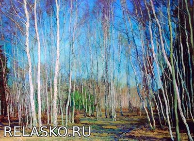 Группа деревьев переднего плана не дает углубиться вдаль, чтобы мысленно оказаться в глубине рощи, ведь взгляд останавливается на белоснежных стволах берез, которые расположились вначале. Так и хочется оказаться среди берез, прикоснуться к их стволам, подставить солнцу свое лицо, вдохнуть свежий весенний воздух.