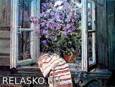 Сами цветы как будто только недавно бережно сорваны и поставлены на окно. Для более объемного изображения, художник использует множество разных красок: и синий, и черный, и фиолетовый. Благодаря столь мастерскому подходу к цвету у художника, у нас складывается впечатление, что эти очаровательные цветы находятся совсем близко. Сами по себе цветы прорисованы с большой тщательностью и аккуратностью, можно разглядеть каждую деталь и поразиться мастерству художника.
