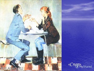 Парень дает более аргументированные ответы и скорее всего он победит в споре. Девушка задумалась и не факт, что она найдет ответ на слова своего собеседника. Ю. Пименов смог так тонко изобразить происходящее на своей картине, что любой человек, смотрящий на нее, сразу поймет, в чем ее суть и что на ней изображено. Движения рук молодых людей указывают на то, что они интеллигентные люди, уважающие мнение другого человека. Их спор не переходит в ругань, они соратники и просто делятся своими впечатлениями и мнениями.