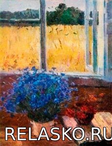 Скоро васильки повянут, а их заменят другие цветы. Этим утром их собрали в огромный букет. И сейчас голубые головки радостно зовут и манят навстречу. Художник написал цветы жирными, точными мазками. Не вдаваясь в детали, мастер создавал общую атмосферу радости и счастья. Створка окна приоткрыта, но это всего лишь интерьер. Рядом, с подоконником, на открытых, белых страницах книги, расположен горшочек с веточкой рябины. Ее красные ягоды, на художественном полотне, имеют темный, неяркий цвет. Они находятся, как бы, внизу, в полумраке.