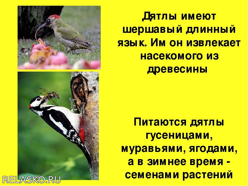 а) внешний вид; б) место обитания; в) что едят дятлы?
