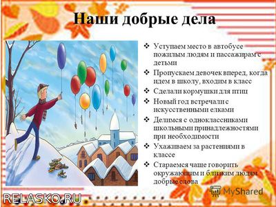 Снять кошку с дерева, помочь знакомой пожилой женщине донести сумку до дома, покормить бездомное животное, убрать в мусорный бак брошенную кем-то бумажку, посадить цветы во дворе, стереть со стены нецензурную надпись, помочь кому-то выйти из транспорта (или войти). Будьте внимательны к людям. Пропустите кого-то без очереди (старика; мамочку с ребенком; кого-то, кто очень спешит…) Всегда помогайте мамочке, которой трудно спустить по ступенькам коляску; деду старому, который читает состав продукта и ничего не видит. Но добрые дела - это не только те, которые совершаются ради незнакомых людей или животных.