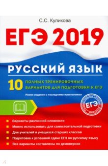Основной рекомендуемый учебник, решебник и ГДЗ в этом году для подготовки к экзаменам ЕГЭ - это новый сборник Светлана Куликова: ЕГЭ 2019. Русский язык. 10 полных тренировочных вариантов к ЕГЭ