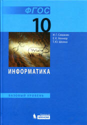 Учебник предназначен для изучения курса информатики на базовом уровне в 10 классах общеобразовательных учреждений. Содержание учебника опирается на изученный в основной школе (в 7–9 классах) курс информатики. В учебнике рассматриваются теоретические основы информатики: понятие информации, информационные процессы, измерение информации, кодирование и обработка информации в компьютере. Излагаются принципы структурной методики программирования, язык программирования Паскаль. В состав учебника входит практикум, структура которого соответствует содержанию теоретического раздела учебника. Учебник входит в учебно-методический комплект, включающий также учебник для 11 класса и методическое пособие для учителя. Соответствует Федеральному государственному образовательному стандарту среднего (полного) общего образования (2012 г.).