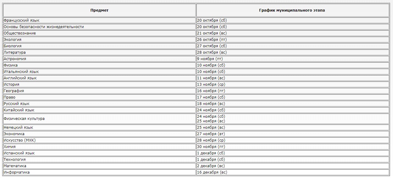 График, сроки и расписание проведения муниципального этапа Всероссийской Олимпиады Школьников