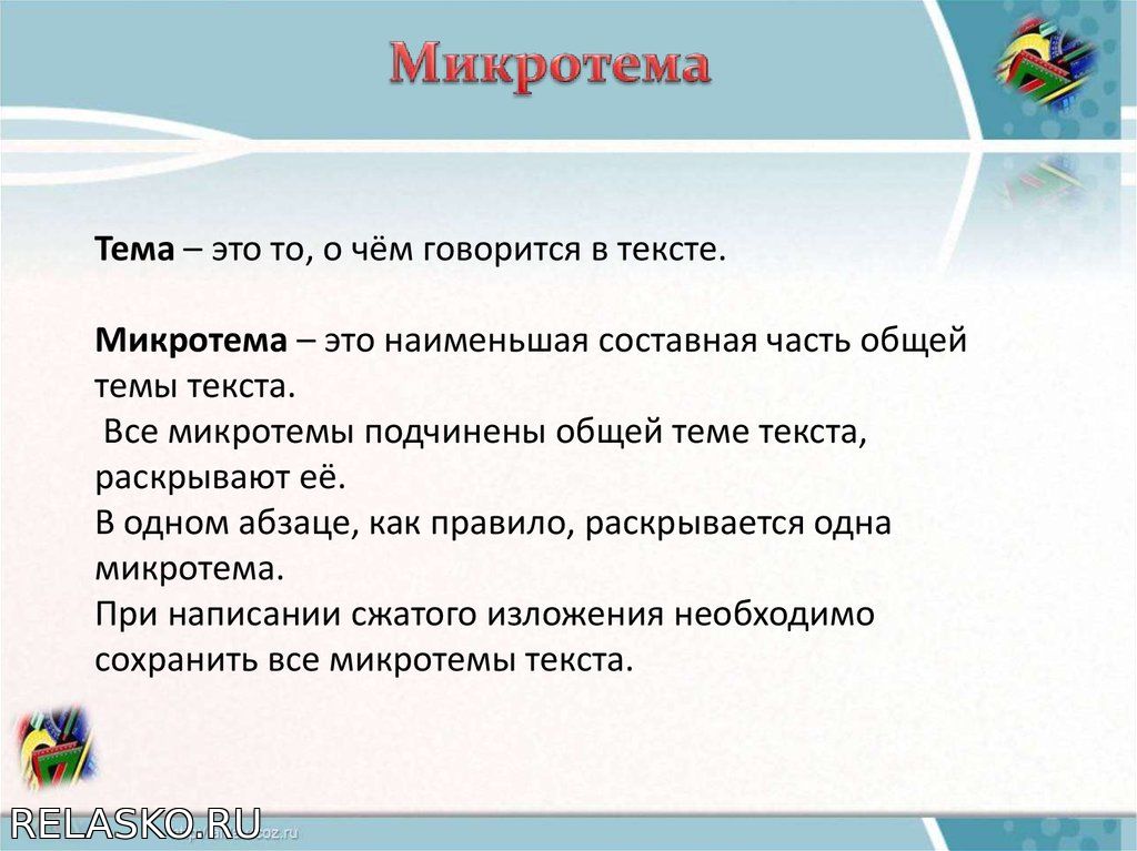 Микротемы. Тема — это то, о чём говорится в тексте. И она, как правило, раскрывается через несколько маленьких подтем.