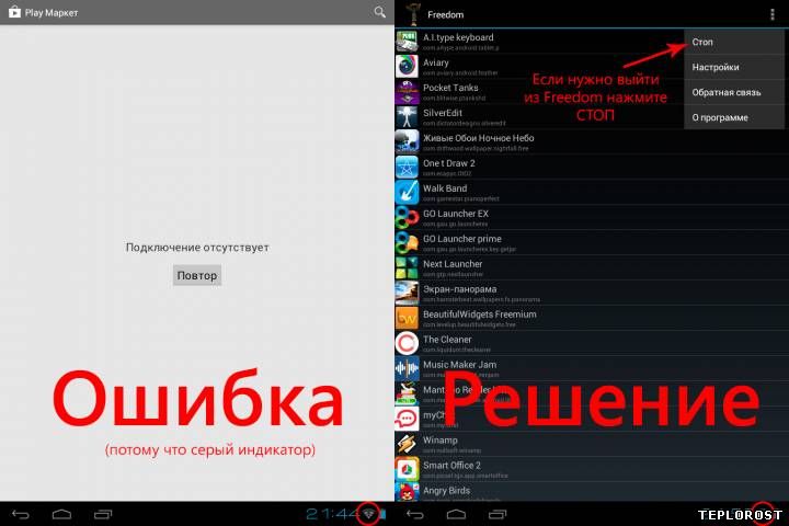 Если Вы не нашли в файле hosts лишних записей, то скорее всего: Вы подхватили вирус. Попробуйте установить мобильный антивирус, например Avast Free Antivirus и проверить систему. Плохая связь или загруженный сервер. Возможно у Вас просто плохой сигнал или произошли какие-то сбои в работе сервера. Попробуйте перезагрузить устройство (выключить и включить заново). Запомните код ошибки, который Вам выдаёт Google Play и попробуйте поискать решение проблемы в Интернете. У Вас есть LuckyPatcher или Freedom? Запустите программу Freedom* и подождите 1-2 минуты, пока индикатор Wi-Fi не станет синим. Теперь можно нажать Стоп в меню и закрыть программу (либо ничего не трогать).