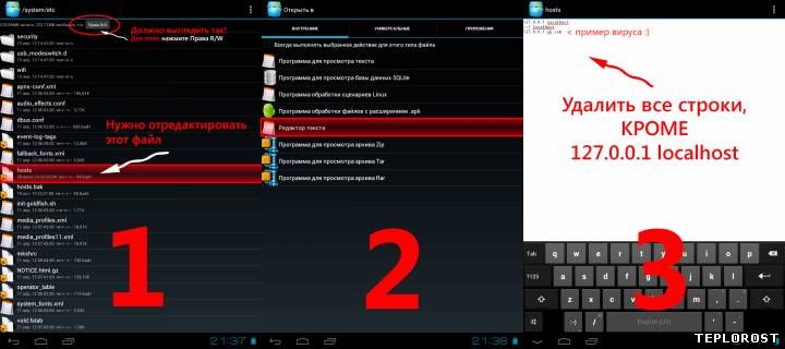 Воспользуйтесь Root Explorer (у него интерфейс лучше): Перейдите в папку system/etc/ Переключитесь в режим R/W (Read & Write) нажав на кнопку «Права R/W». Далее нажмите на файл hosts и выберите «Редактор текста». Удалите подозрительные строки (всё кроме 127.0.0.1 localhost) и сохраните файл.
