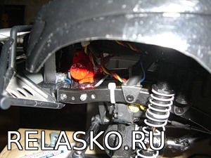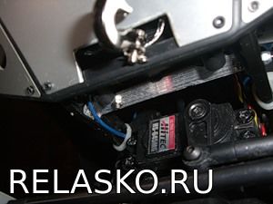 1) Снять штатную пластиковую поперечину (перед сервомашинкой) и, соответственно, вертикальный столбик, поддерживающий спереди площадку аккумулятора.