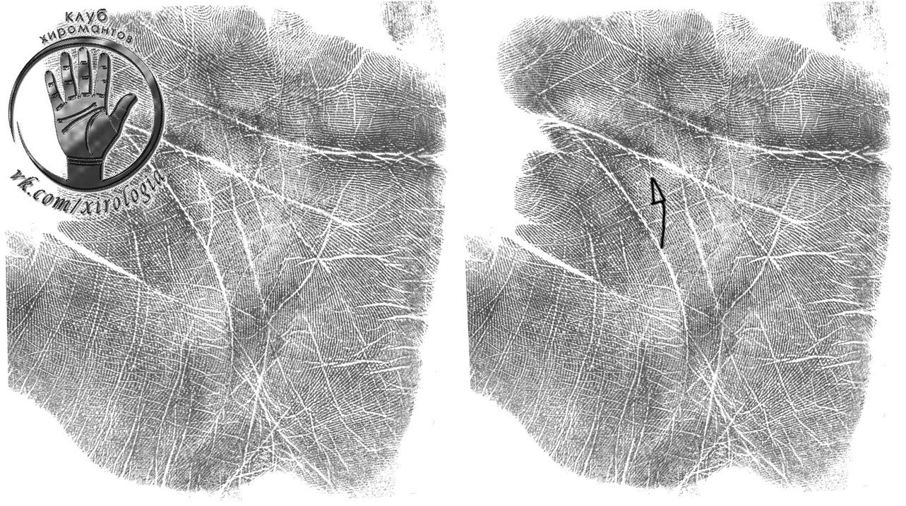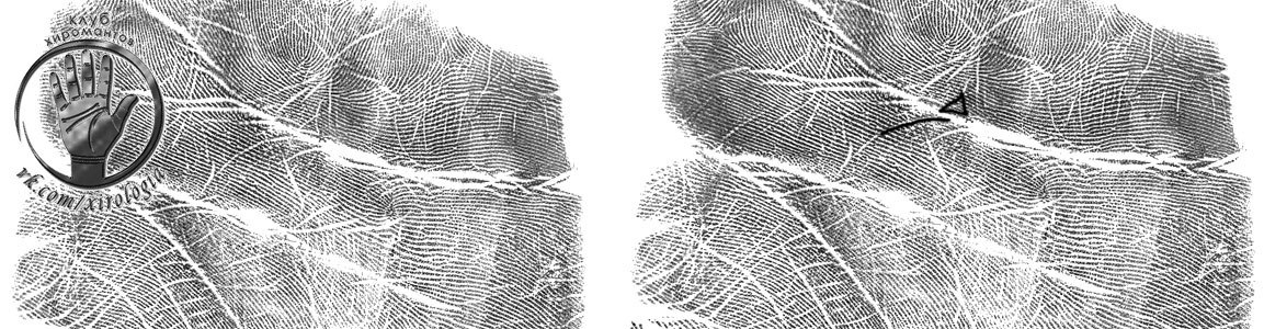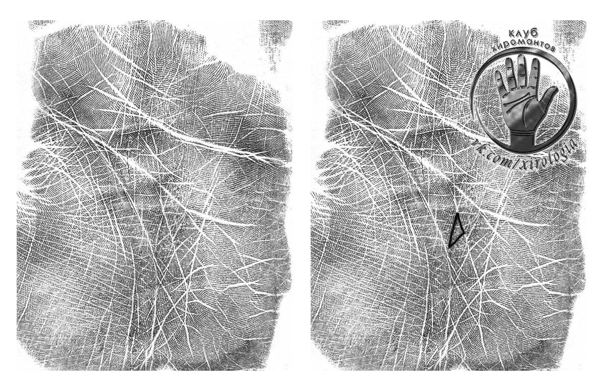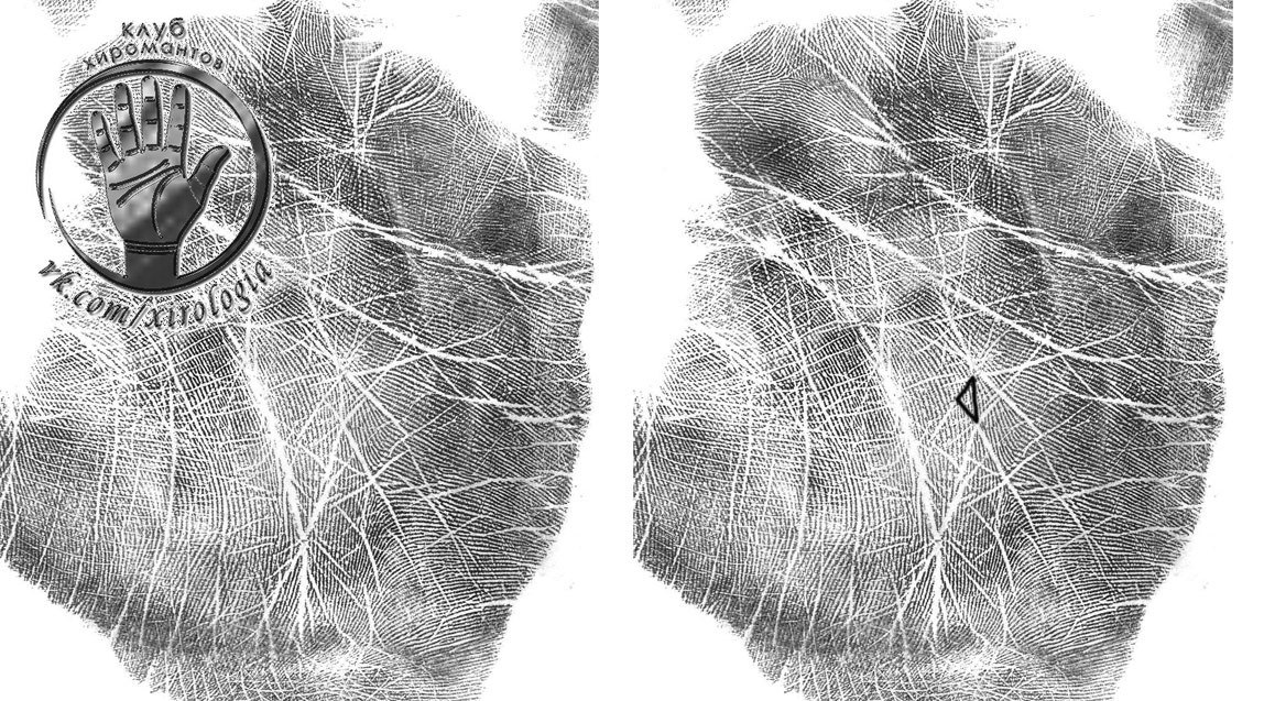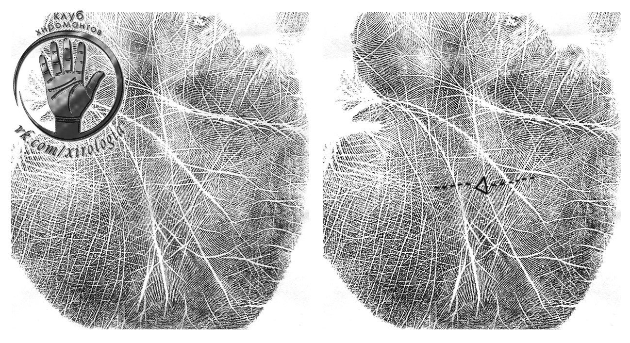 Треугольник примыкает к линии Судьбы обычно со стороны линии Жизни, на момент приобретения недвижимости может быть несколько треугольных фигур. Мы видим, что и с другой стороны есть подобие треугольника, у нас получаются две треугольные половины, которые примыкают друг к другу. Понимая символически, та сторона, что ближе к линии Жизни – это наша доля, а та, что с холма Луны, доля партнера по браку с которым ранее было случайное знакомство.