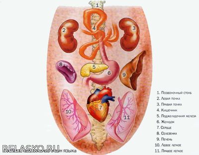 Эта зона отвечает за работу многих систем, но в основном за мочеполовую систему, которая включает в себя также гормоны и железы. Не обращайте внимания на два крупных бугорка по обеим сторонам задней части языка – это обычные вкусовые сосочки. На что следует обратить внимание – это на цвет и налет этой зоны. Толстый желтоватый налет в центре задней части у женщин, например, может говорить об инфекции мочевого пузыря (цистите).