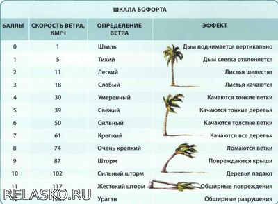 Здравствуйте! ШКАЛА СКОРОСТЕЙ ВЕТРА(есть старые и новые.Но сейчас и метеорологи, и специалисты отраслей хозяйства,используют ТОЛЬКО физическую шкалу скоростей и переходы от одних шкал скорости(не применяйте слово «силы» ветра,это неграмотно)к другим (см. рис.,шкалы совмещены,синхронизированы),можно их телескопизировать (увелич.фото-способом) для повышения точности,и наращивать,т.к.они линейны. Самой старинной шкалой оценки скоростей ветра(когда ещё не умели точно измерять), была качественная(словесная)шкала скоростей ветра"Бофорта"по имени автора,Фрэнсиса Бофорта,английского морского офицера,дослужившегося до контр-адмирала английского военного флота(1774-1857 гг.).См. h tp://http://www.vodkomotornik.ru/index.php?option=com_content&view=article&id=15&Itemid=15 Шкала уточнена (м/с) Всемирной Метеорологической организацией (ВМО табл.)и иногда она применяется для словесной оценки,но является примерной и устаревшей(сейчас пользуются только м/с). (см., какой слабый ЛО в этом ответе!) Шкала Бофорта имеет 12 баллов (градаций), которые в м/с(ВМО)выглядит так: ============================================= Балл Бофорта ------скорость в м/с..-----Словесная характеристика ---------------------------------------------------------------------------- 0 баллов: от 0 до 0,2 м/с - "штиль" 1 балл: от 0,3 до 1,5 м/с - "очень слабый ветер" 2 балла: от 1,6 до 3,3 м/с - "слабый ветер" 3 балла: от 3,4 до 5,4 м/с - "от слабого до умеренного" 4 балла: от 5,5 до 7,9 м/с - "умеренный" 5 баллов: от 8,0 до 10,7 м/с "от умеренного до сильного" 6 баллов: от 10,8 до 13,8 м/с "сильный" 7 баллов: от 13, 9 до 17,1 м/с "от сильного до очень сильного" 8 баллов: от 17,2 до 20,7 м/с "очень сильный" 9 баллов: от 20,8 до 24,4 м/с "от очень сильного до штормового" 10 баллов: от 24,5 до 28,4 м/с "штормовой" или "буря" 11 баллов: от 28,5 м/с до 32,6 м/с "от штормового до ураганного" 12 баллов: от 32,7 м/с и более "ураган".