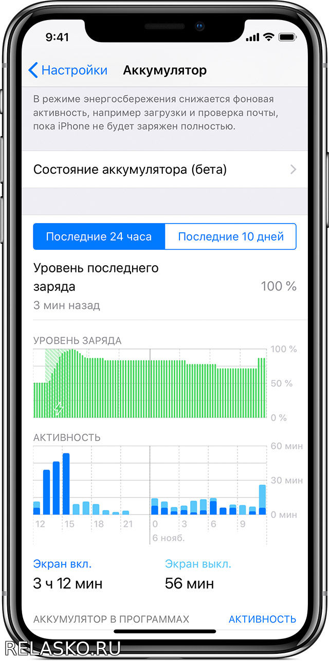 Чтобы просмотреть уровень и расход заряда аккумулятора за последние 24 часа и в течение периода до 10 дней, перейдите в меню «Настройки» > «Аккумулятор».