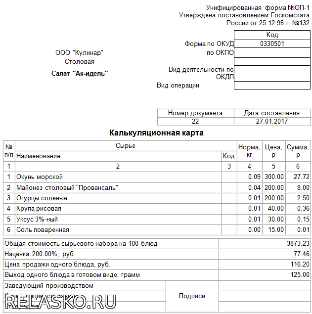 Таблица 2 – Расчет выхода блюда