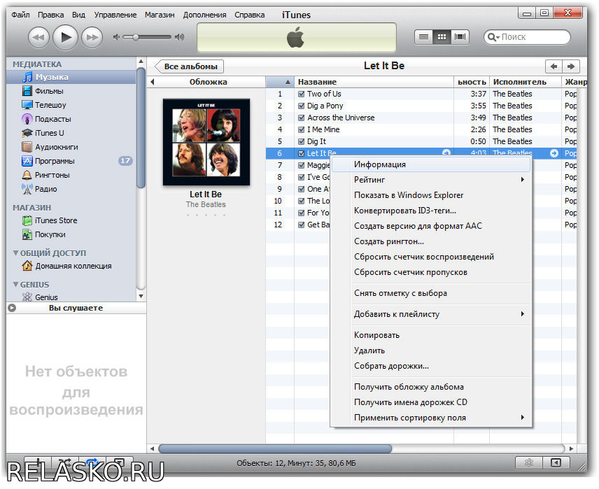 iTunes Переходим ко вкладке «Музыка», кликнув по значку с нотой в левом верхнем углу. На скриншоте выше он уже активен; В списке слева выберите «Музыка», сразу под разделом «Медиатека», чтобы открылся весь список Ваших песен – одна из них и станет рингтоном; Кликаем по нужной песне правой кнопкой мыши, ждём пока появится контекстное меню. Нажимаем на пункт «Сведения» или «Информация» (зависит от версии программы);