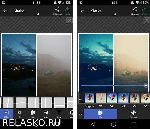 По желанию мы можем изменить фон нашего коллажа (по умолчанию белый) или дать ему текстуру, а также установить цветовые фильтры, как в приложении Instagram. Также стоит обратить внимание на настройку фотографий. Как только мы выберем макет, мы все равно можем сопоставить наши фотографии с ним. Фотографии могут быть увеличены или уменьшены и перемещены влево / вправо / вверх / вниз, чтобы показать самый важный элемент фотографии.