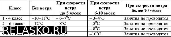 В приложении к СанПиН 2.4.2.2821-10 есть рекомендации по проведению физкультуры на открытом воздухе. Для средней полосы эти нормы такие: