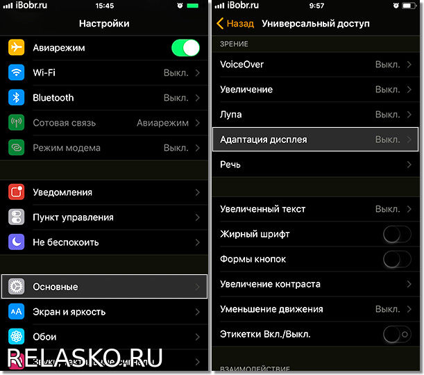 Запускаем на рабочем столе iPhone приложение Настройки – Основные – Универсальный доступ – Адаптация дисплея