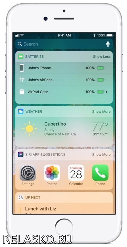 Статус зарядки своих AirPods и чехла можно узнать и с помощью полезного виджета на экране «Сегодня», который открывается свайпом вправо по домашнему экрану. Отображаться он будет, только когда хотя бы один наушник будет находиться в чехле.