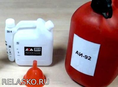 Теперь давайте разберемся с не менее важной задачей которая касается того собственно в чем нужно производить такого рода манипуляцию. Итак. На сегодняшний день специализированные магазины располагают специальными канистрами, которые располагают определенными делениями мерного характера, а также парой отверстий – одно предназначено для масла, второе — для бензина.