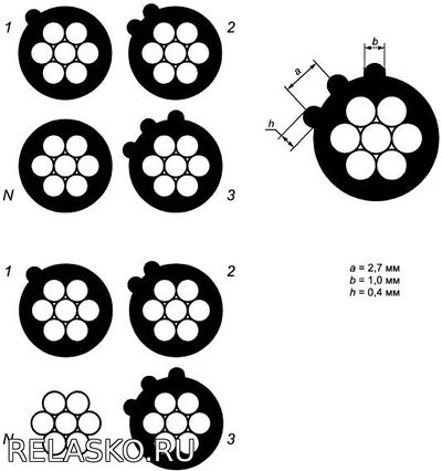 5.2.7.2 Основные токопроводящие жилы самонесущих изолированных проводов должны иметь отличительное обозначение в виде продольно выпрессованных рельефных полос на изоляции, как показано на рисунке Б.1 (приложение Б), или цифр 1, 2, 3, нанесенных тиснением или печатным способом. Изолированная нулевая несущая жила не должна иметь отличительного обозначения. Отличительное обозначение также может быть выполнено в виде цветных продольных полос шириной не менее 1 мм. Цвет полос должен быть контрастным по отношению к черному цвету. Вспомогательные жилы для цепей освещения должны иметь отличительное обозначение: "В1", "В2" или "В3", нанесенное тиснением или печатным способом. Маркировка цифрами и буквами тиснением или печатным способом должна производиться с интервалом не более 500 мм. Высота цифр (букв) должна быть не менее 5 мм, ширина - не менее 2 мм (для цифры 1 минимальная ширина - 1 мм). Вспомогательные жилы для цепей контроля могут не иметь отличительного обозначения. Отличительное обозначение, выполненное печатным способом или в виде цветных продольных полос, должно быть стойким к воздействию солнечного излучения в течение всего срока службы.