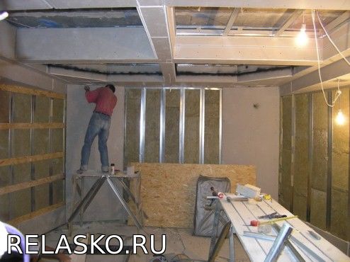 Эту задачу могут решить потолочные звукоизоляционные панели, гипсокартон, подвесные, и (в меньшей степени) натяжные потолки. Наиболее демократичным по цене будет, конечно же, гипсокартон. На потолке сначала монтируется металлическая конструкция, затем к ней крепятся листы гипсокартона, а в пространстве между потолком и листом можно проложить мягкий звукоизоляционный материал.