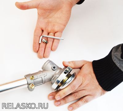 Выкручиваем боковой винт на редукторе мотокосы. В зависимости от фирмы – производителя садового инструмента вместо винта под шестигранник может быть болт под ключ, чаще на 17. Резьба обычная, откручиваем против часовой стрелки. Не потеряйте уплотнительную шайбу.