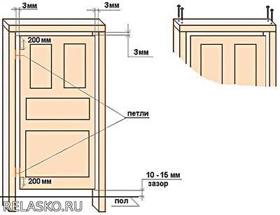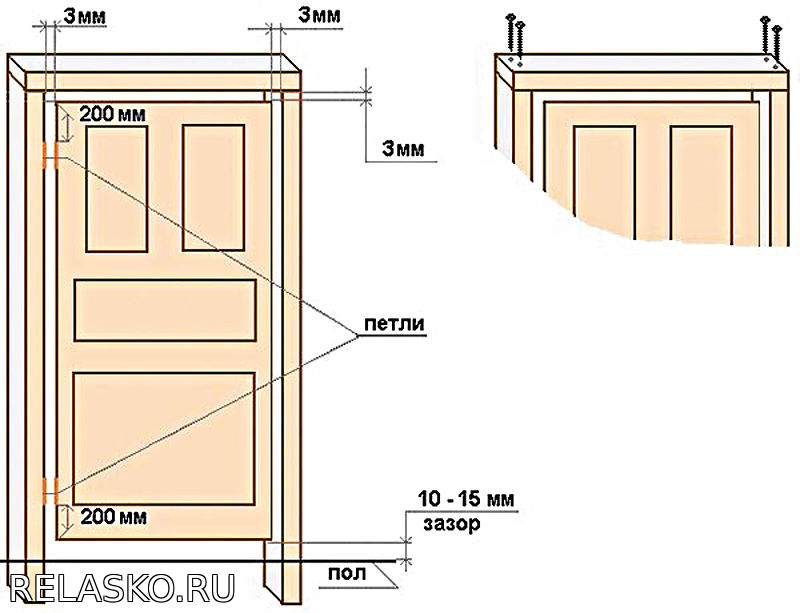 При сборке дверной коробки следует учитывать следующие зазоры: между дверью и верхом коробки (около 3-5 мм), между дверью и сторонами коробки (порядка 3 мм), между дверью и порожком (10-15 мм).