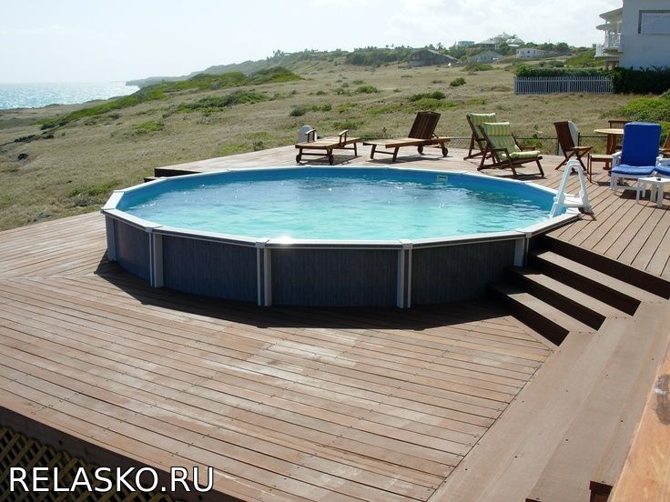 Бассейн на подиуме — зачем и как Другой вариант устройства — создание жёсткого и выступающего над землёй основания под надувной бассейн. Два простейших примера: монолитная бетонная плита и дощатый настил на сваях или кирпичных тумбах