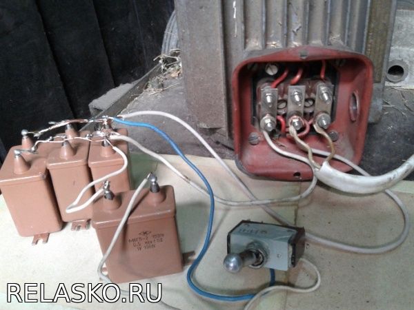 Пусковой конденсатор подключается параллельно рабочему и должен включаться только в момент запуска двигателя, после того как двигатель наберет обороты его необходимо отключать. Емкость пускового конденсатора должна быть в 2,5 — 3 раза больше рабочего.