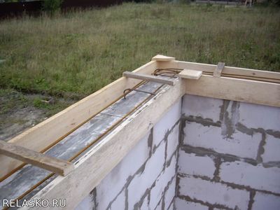 Блоки из-за пористой структуры крайне негативно относятся к точечной нагрузке. Поэтому установка армирующего пояса из бетона является необходимостью. Его оптимальная высота для керамзитобетонной кладки — 10—20 см. Ширина может быть равна ширине блоков или быть чуть меньше. Отступы могут понадобиться для укладки утеплителя или облицовочного материала (около 5—10 см)