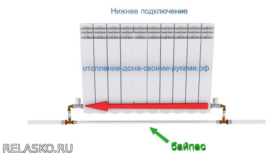 Конструктивные особенности подключения нижнего типа Сегодня в продаже имеются специальные радиаторы, подключаемые в нижней части. Конструкция в них такова, что способствует максимальной отдаче тепла, а отличительная черта – это применение узла, встречаемого в сантехнике (байпас + арматура).